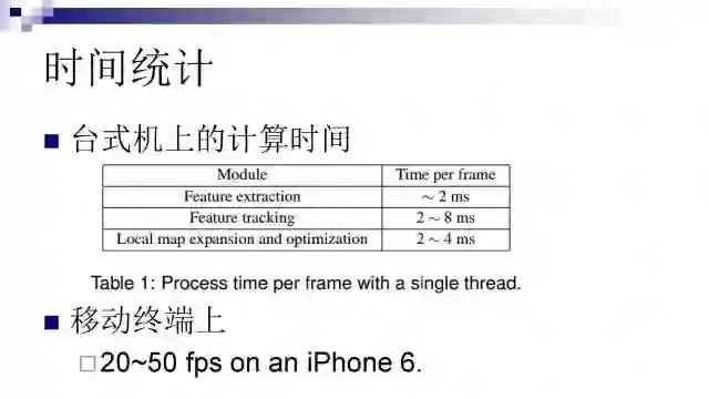 RKSLAM的速度非常快。在台式机上可以达到每秒100~200帧,在iPhone6上可以达到每秒20~50帧,完全能够满足实时应用。