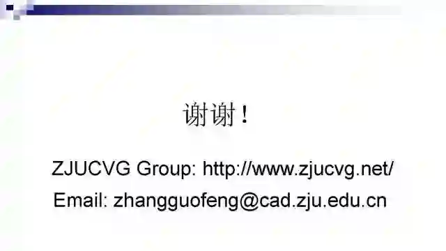 最后是对未来工作进行展望。我们接下来要做的一个工作是协同SLAM,比如使用多个无人小飞机进行协同配合完成一个指定的任务。另外一个工作是稠密SLAM,这个也是目前我们正在做的一个工作。此外,就是基于SLAM的场景分析和理解。最后,基于这些技术在VR、AR、机器人和无人驾驶领域进行应用。