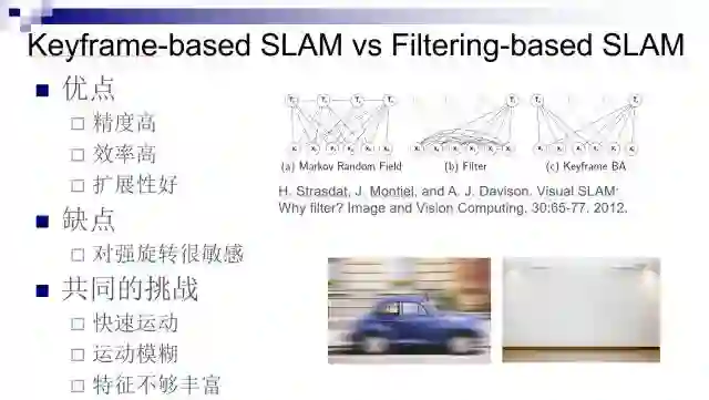 现在Visual SLAM技术方法主要分为两类,一个是keyframe-based SLAM,另一个是filtering-based SLAM。2012年Andrew Davison等人写了一篇文章对这两个方法进行了比较,得出这样的结论:keyframe-based SLAM比filtering-based SLAM在精度上、效率和扩展性上具有更好的性能。但是keyframe-based SLAM也有缺点,一般对强旋转比较敏感。当然,快速运动、运动模糊、特征不够丰富等情况对于这两类方法都很有挑战性。
