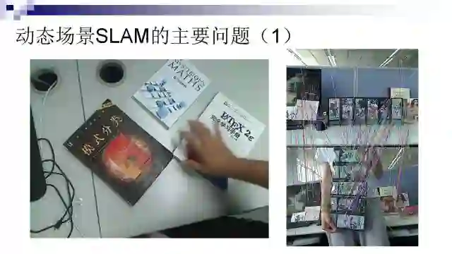 比如左边的例子,人在移动书本,过了几十秒所有的书本的位置都发生了变化,这对传统的SLAM来说是非常难处理的。另外,动态元素还会导致大量的错误匹配,这对实时稳定的SLAM求解来说也是非常困难的。