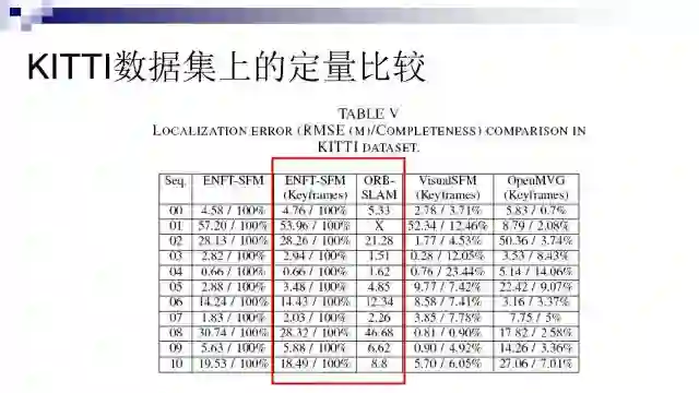这是我们的ENFT-SLAM和ORB-SLAM的比较,输入的数据都是实时的单目视频序列。可以看到我们的结果更好。主要是我们在两个模块上做得更好:一是我们的非连续轨迹匹配比ORB-SLAM采用的Bag-of-words Place Recognition方法能匹配上更多的公共特征点;二是我们使用的基于分段的集束优化方法,不容易陷入局部最优解,比起ORB-SLAM采用的位姿图优化和传统集束优化结合的方法效果更好。