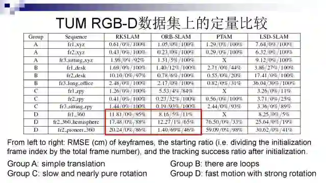 这是我们在TUM RGB-D数据集上的定量比较。这里我们只用了RGB信息,没有用深度信息。我们选了12组序列,分成了4组。其中Group D的序列都是相机运动非常快而且带有强旋转。实验结果表明,在Group D的跟踪成功率上,我们的方法要明显好于ORB-SLAM和其他方法。