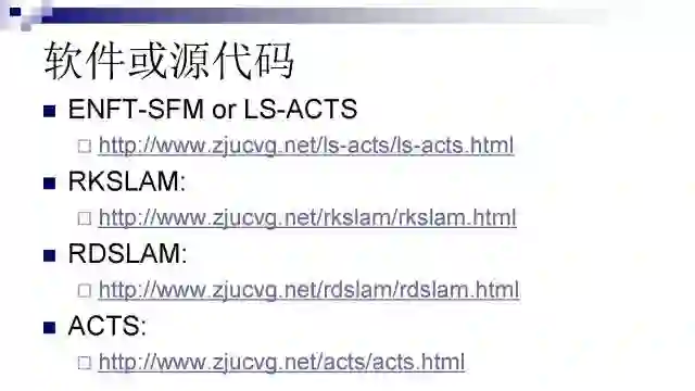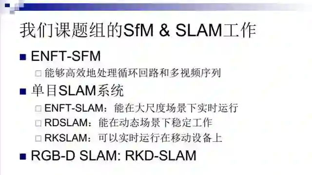 研发了一个大尺度运动恢复结构系统ENFT-SFM,能够高效地处理循环回路和多视频序列;在单目SLAM方面,主要做了三个方面的工作,其中ENFT-SLAM是在ENFT-SFM上的进一步改进和实时化,能在大尺度场景下实时运行,RDSLAM则主要针对动态场景做了优化,而RKSLAM专为基于移动终端的增强现实应用设计,速度非常快,可以在移动设备上实时运行。另外,针对RGB-D摄像头,我们最近也做了一个基于关键帧的同时定位与稠密地图构建系统RKD-SLAM。接下来将分五部分做详细介绍。
