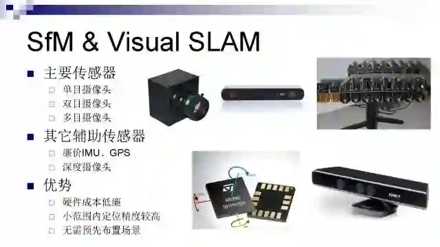 SfM可以分为离线和实时的,而实时的SfM其实就是Visual SLAM。Visual SLAM主要采用摄像头传感器,根据摄像头的数目可以分为单目摄像头、双目摄像头和多目摄像头等。现在的Visual SLAM也在结合其它一些传感器,比如手机上的廉价IMU、GPS和一些深度摄像头来做到更加鲁棒的SLAM。