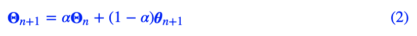 这里的 Δθn 就是优化器带来的更新,优化器可以是 SGD、Adam 等任意一种。而滑动平均则是维护一组新的新的变量 Θ: