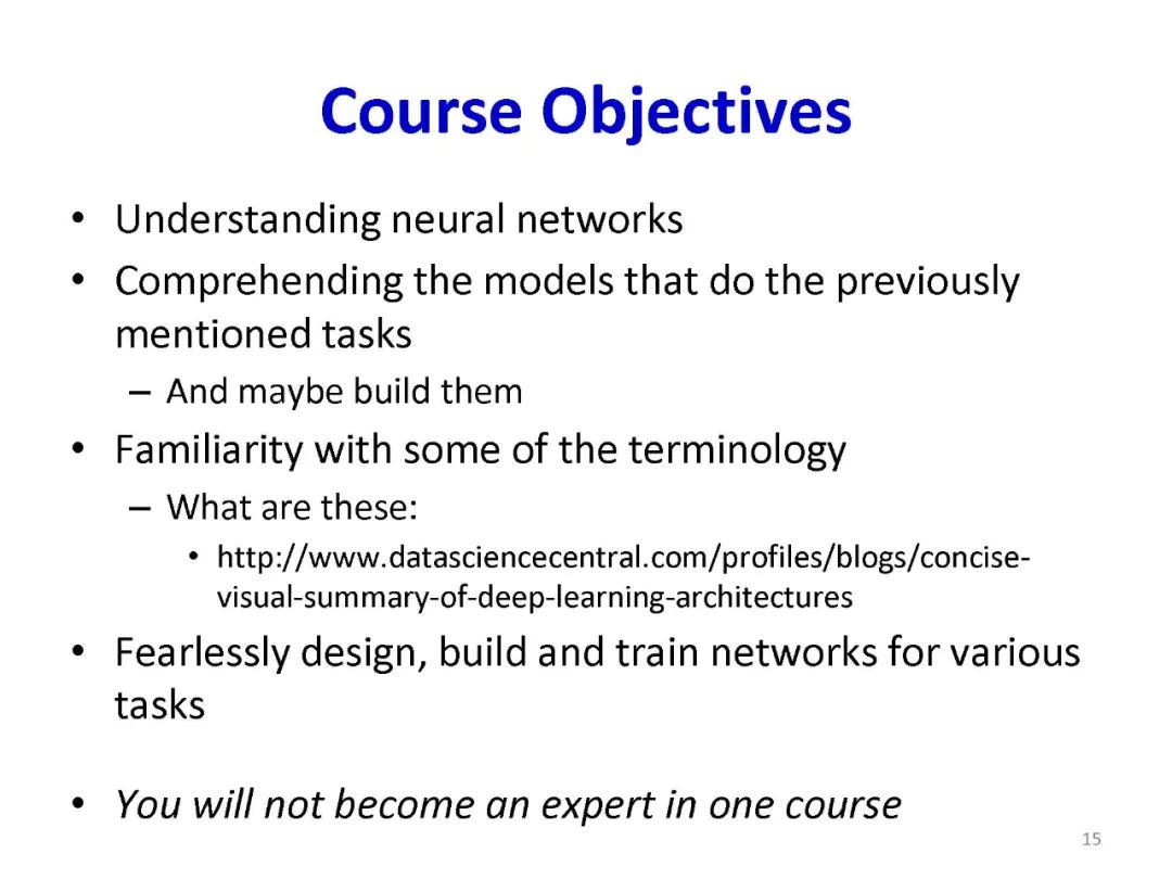 在本课程中,我们将学习深度神经网络的基础知识,以及它们在各种人工智能任务中的应用。在本课程结束时,预计学生将对这门学科非常熟悉,并能够将深度学习应用于各种任务。他们也将被定位去理解关于这个主题的许多当前的文献,并通过进一步的学习来扩展他们的知识。