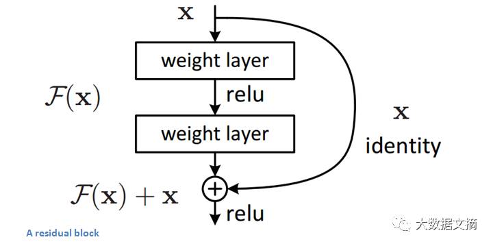Residual Block背后的想法是把输入x通过conv-relu-conv序列输出。 这将先输出一些F(x),再把这些结果添加到原始输入x 即H(x)= F(x) + x。 而在传统的CNN中,H(x)直接等于F(x)。 所以,在ResNet中,我们不仅计算这个简单转换(从x到F(x)),还将F(x)加到输入x中。 在下图所示的迷你模块计算中,原输入x被做轻微变化,从而得到一个轻微改变的输出 。(当我们考虑传统CNN时,从x到F(x)是一个全新的表达,不保留关于原始x的任何信息。 作者认为“优化残差映射比优化原始映射更容易。”)