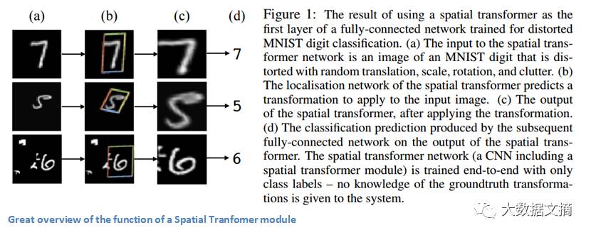 最后,让我们走近一篇最近发表的论文。这篇文章是由Google Deepmind的一个小组在一年多前撰写的,主要贡献是引入空间变换模块。这个模块的基本思想是, 以一种方式转换输入图像,使得随后的图层更容易进行分类。作者担心的是在将图像在输入特定的卷积层之前出现的更改,而不是对CNN主体架构本身进行的更改 。这个模块希望纠正的两件事情是,形状正则化(对象被倾斜或缩放)和空间注意力(引起对拥挤图像中的正确对象的关注)。对于传统的CNN,如果你想使模型对不同尺度和旋转的图像保持不变性,你需要大量的训练示例。让我们来详细了解这个变换模块是如何帮助解决这个问题。