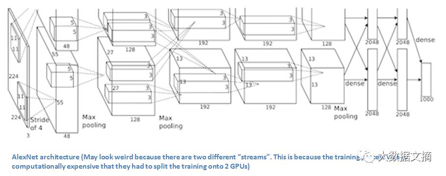 这篇论文里讨论了AlexNet神经网络的具体结构。相比现在流行的神经网络构架,它的结构其实非常简单:5个卷积层、最大池化层(max pooling layer),dropout层,和3个全连接层(fully connected layers)。但这个结构已经可以被用来分类1000种图片了。