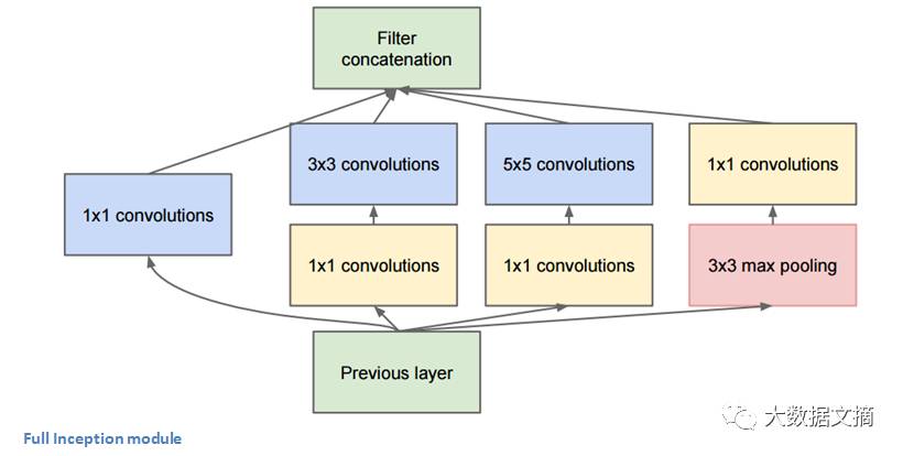 你还可以用一个池化操作来减少占用空间大小,并防止过度拟合。 此外,每个卷积层之后都进行ReLUs,这有助于提高网络的非线性。大体来讲,这样的网络能够做到执行各类操作的同时仍保持计算性。 这篇论文还提出了一个高层次的推理,涉及稀疏性(sparsity)和密集连接(dense connections)等主题。(参见论文http://www.cv-foundation.org/openaccess/content_cvpr_2015/papers/Szegedy_Going_Deeper_With_2015_CVPR_paper.pdf的第3段和第4段。我并不很理解这方面的内容,但很乐意听到你们在评论中发表自己的见解。)