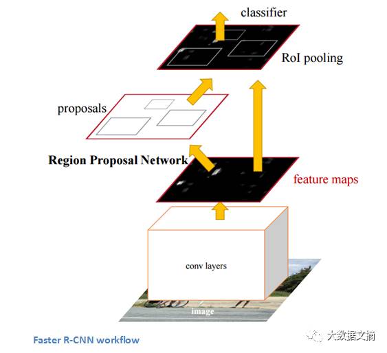 Faster R-CNN可以用于解决R-CNN和Fast R-CNN所使用的复杂的训练管线 。 作者在最后一个卷积层之后插入了一个区域候选网络(region proposal network,RPN)。 该网络能够在仅看到最后的卷积特征图后就从中产生区域建议。 从那个阶段开始,与R-CNN相同的管道就被使用了(感兴趣区域池层 ROI pooling,全连接层FC, 分类classification,回归regression… )。