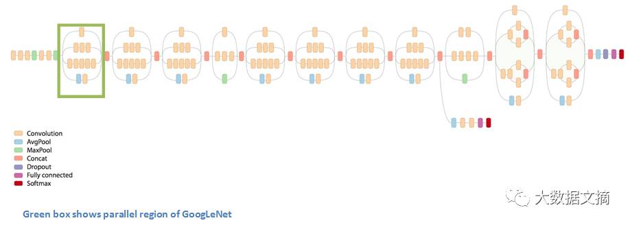 上图绿框里的结构叫做Inception模块。下面让我们来仔细看一下它的构成。