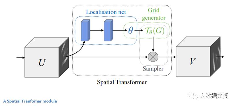 传统CNN模型中,处理空间不变性的实体是最大分池层[1] ( maxpooling layer)[2] 。 这一层背后的直观原因是,一旦我们知道某一个特定的特征位于原始输入空间内(任何有高激活值的地方),它的确切位置就不像其他特征的相对位置那样重要了。 这种新的空间变换器是动态的,它将为每个输入图像产生不同的行为(不同的扭曲或变换)。 它不仅仅是一个传统的maxpool那么简单和预定义。 我们来看看这个变换模型的工作原理。 该模块包括: