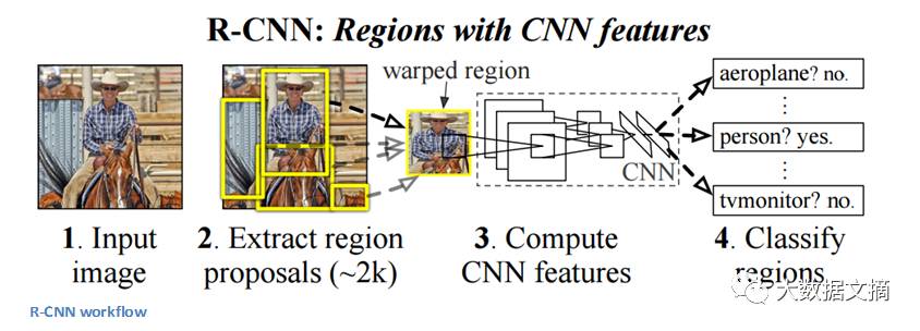 作者指出,任何类别不可知的区域提取方法都能用于R-CNN。 其中选择性搜索(https://ivi.fnwi.uva.nl/isis/publications/2013/UijlingsIJCV2013/UijlingsIJCV2013.pdf)特别适用于R-CNN。选择性搜索先执行生成 2000个概率最高的含有物体的不同区域的函数。随后这些被建议的区域都被“扭曲”(warp)成为一个个合适尺寸大小的图像, 输入到一个训练好的CNN(文章里用的是AlexNet)。这个CNN将为每个区域提取出一个特征向量,然后这些向量被输入到一组针对每类物体分别进行训练的线性SVM,从而输出分类结果。 同时这些向量也被输入给训练好的边界框回归器,以获得最准确的坐标。