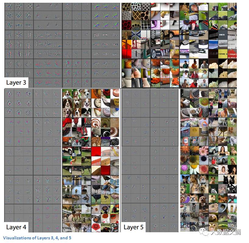这些层已经能显示出更高级特征,像是小狗和花朵。别忘了在第一层卷积之后,我们一般会有一个池化层减少图片的采样(例如从32x32x3减少到16x16x3)。这样做能让第二层对原始图片有一个更广阔的视角。如欲获取更多关于deconvnet和这篇论文的信息,可以看看Zeiler他本人这篇演讲(https://www.youtube.com/watch?v=ghEmQSxT6tw)。