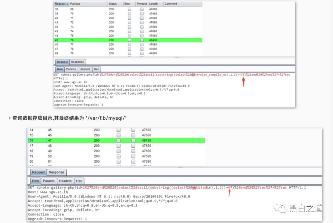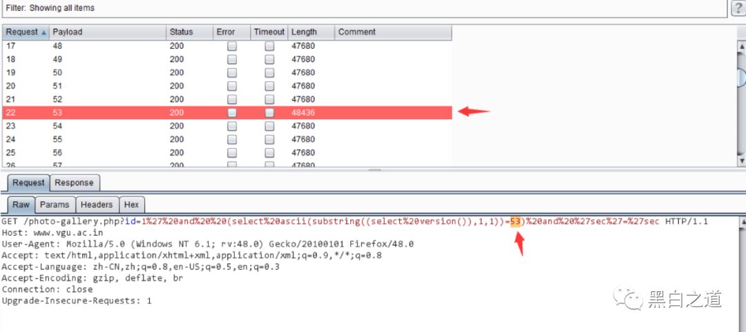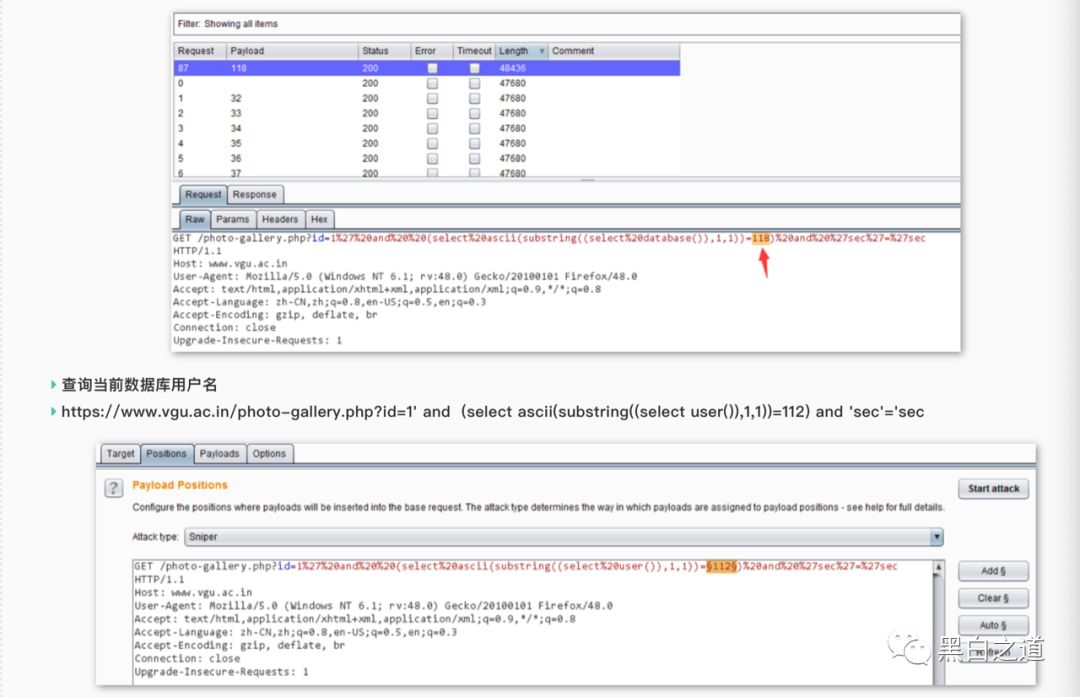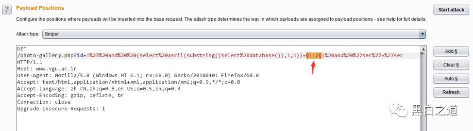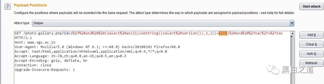 查询数据库版本,大家可能也看到了,盲注的本质,其实就是逐个字符的截取判断,像这种重复性的操作,如果纯手工来的话,估计得累死,还是老办法,我们直接拿burpsuite跑一下就好了,根据经验,像版本号一般都不会太长,20个足矣,常用的ascii码值,一般也都会在32-127之间,下面只是跑第一位字符,后面你还可以接着把第二位,第三位……字符都按同样的方法跑出来,像这些基础函数在前面都已经详细说明过了,实在不明白可以去看那个