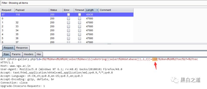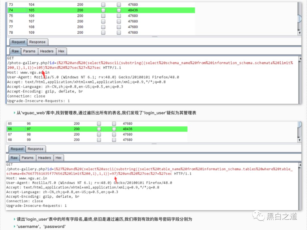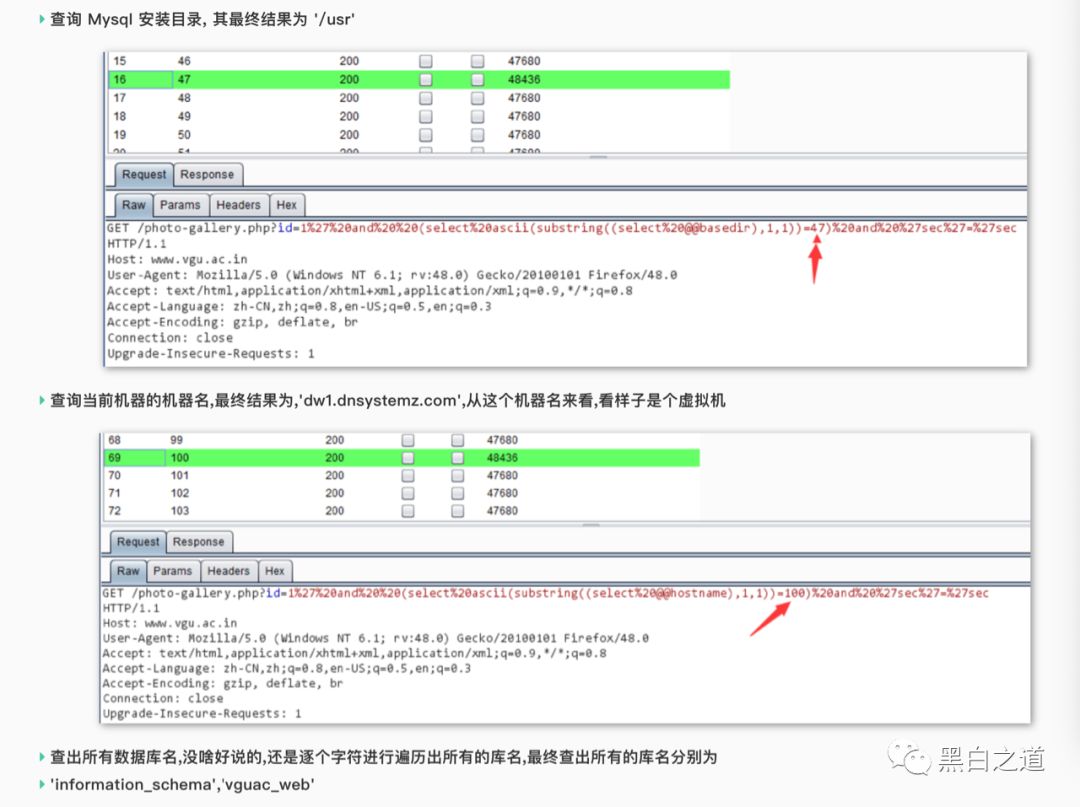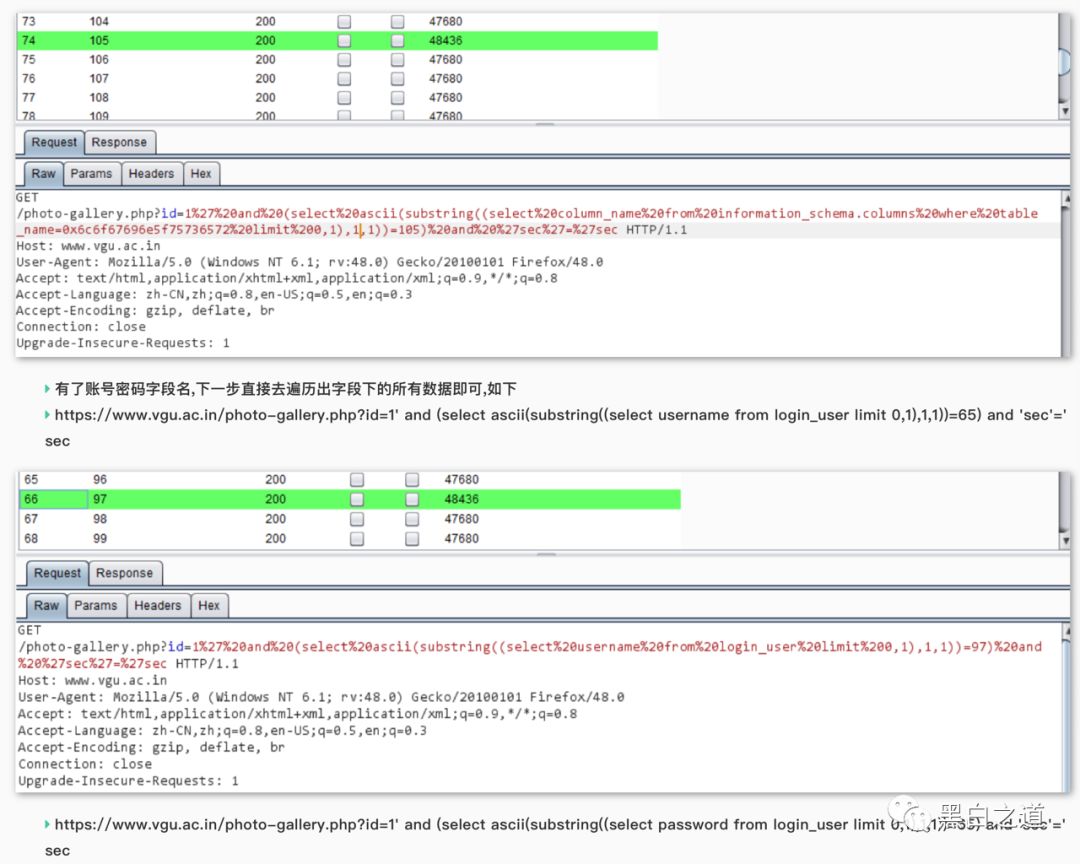 我们看到数据库名的第一个字符对应的 ascii 码值为 118,其对应的字符为’v’,遍历后的最终结果为'vguac_web'