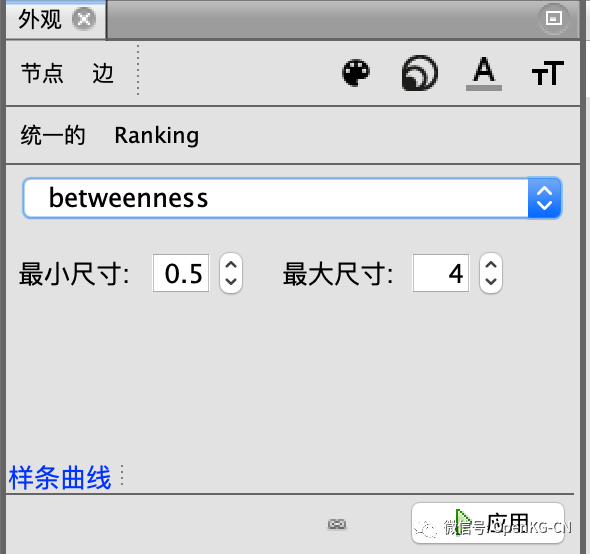 在外观-节点-大小-Ranking 中选择 betweenness(这里的 betweenness 就是我们刚才为每个点添加的 betweenness 属性)