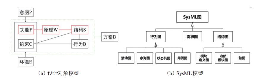 由于设计具有过程性和对象性双重属性,设计的过程实际上是设计对象随着设计过程不断进化的过程,亦即设计对象知识完整度不断提高的过程。因此,基于系统化设计方法和基于模型的系统工程方法并结合 SysML建模语言,可以建立如图 3所示的设计对象模型。其中图 3(a)为基于扩展 FBS的设计对象模型,图 3(b)为基于 SysML的设计对象知识表达模型。