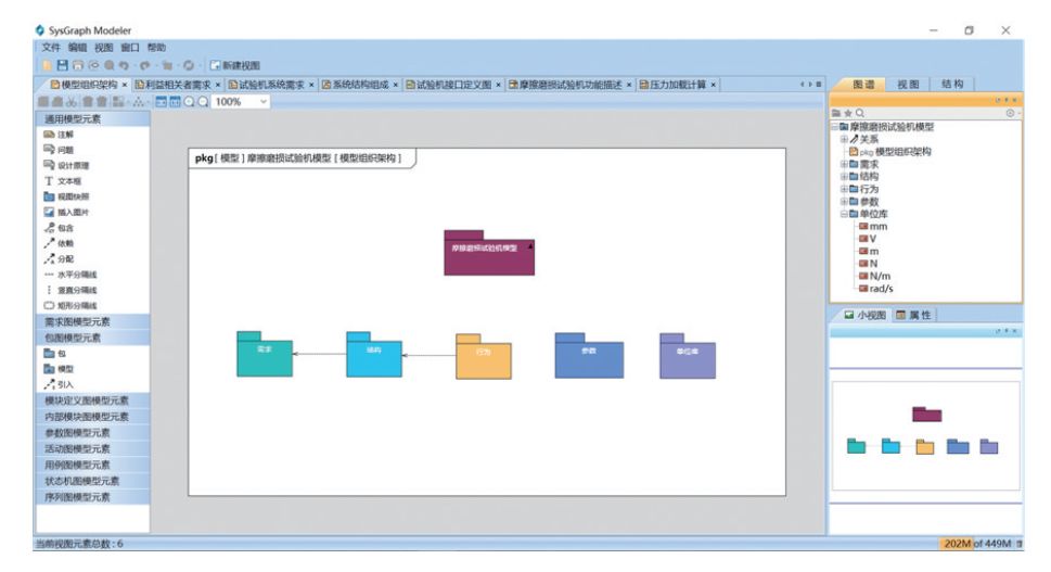 以 FBS扩展模型为指导,基于 SysML建模语言针对微动摩擦磨损试验机进行设计,构建以下模型:组织架构、需求(利益相关者需求、试验机系统需求)、试验机功能结构、系统结构、试验机接口定义以及行为模型,而后采用 SysGraph Modeler工具进行建模实践,以下以模型组织架构图和系统结构图为示例说明如何采用 SysGraph Modeler开展基于模型的复杂机电系统的设计。