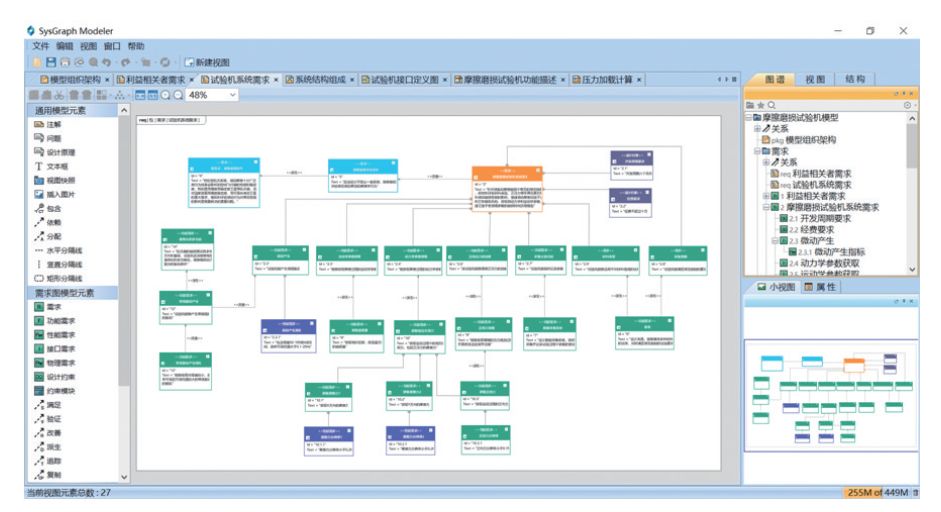 图 6为基于 SysGraph Modeler构建的微动摩擦磨损试验机的系统需求模型图,该模型是对图 5中抽象的需求模型的进一步细化。需求模型中,包括利益相关者需求和系统需求两部分,前者是从用户的角度描述需求,例如用户需要试验机频率高等;后者是从产品的角度描述,例如,试验机的频率应达到多少、载荷范围应为多少等。系统需求详细描述了包括功能需求、性能需求、接口需求、物理需求以及设计约束等在内的系统开发需求,包图中所包含的元素,可在右侧图谱结构中进行查询。