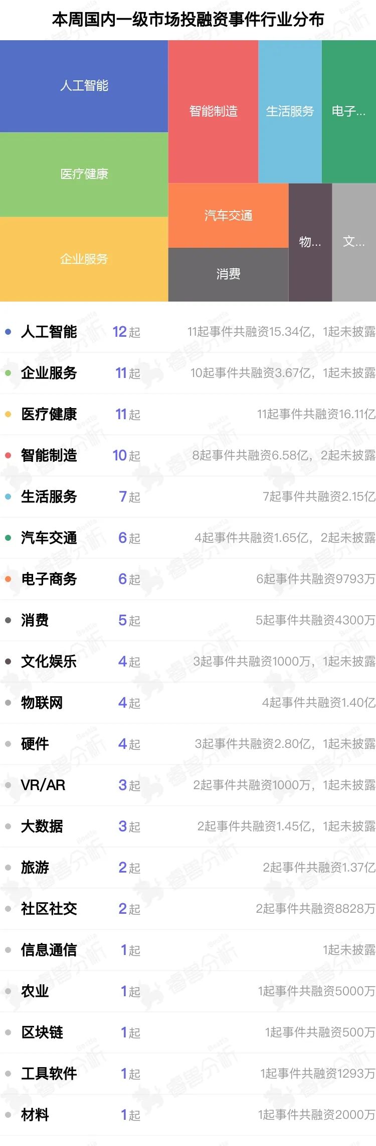 从融资案例数量来看,本周人工智能、企业服务、医疗健康领域融资最活跃,分别为12起、11起、11起。
