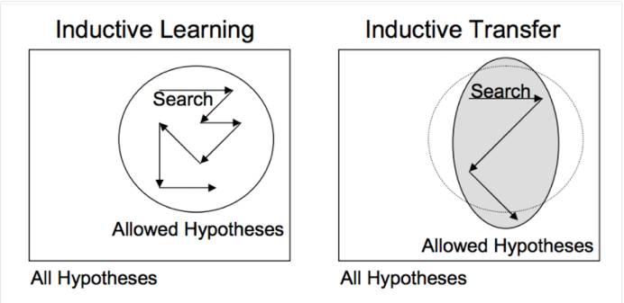 这种用于深度学习的迁移学习形式被称为推导迁移(inductive transfer)。就是通过使用合适但不完全相同的相关任务的模型,将模型的范围(模型偏差)以有利的方式缩小。