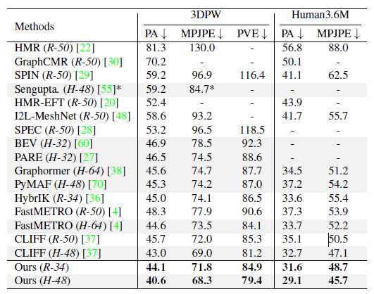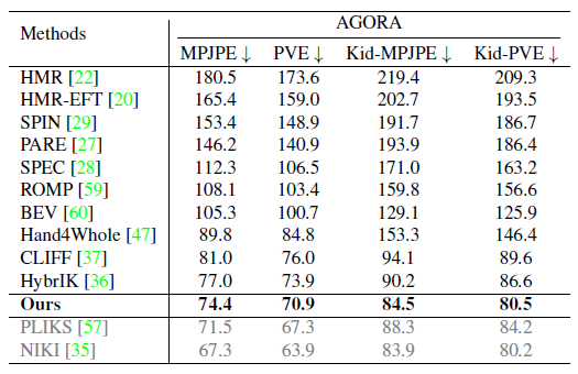 实验部分,本研究在公开数据集 Human3.6M、3DPW、AGORA、TotalCapture 上和过去方法进行了定量对比。可以看到,本研究的方法超越了过去的一众方法。其中右下表中最后灰色的两行是同期工作,这里为了榜单完整性也列了出来。