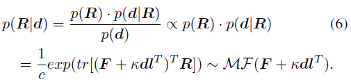 由此可得到结论:后验概率 p (R|d) 同样服从 matrix Fisher 分布,且其参数从 F 更新为 F^'=F+κdl^T。