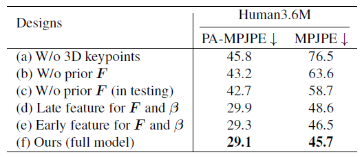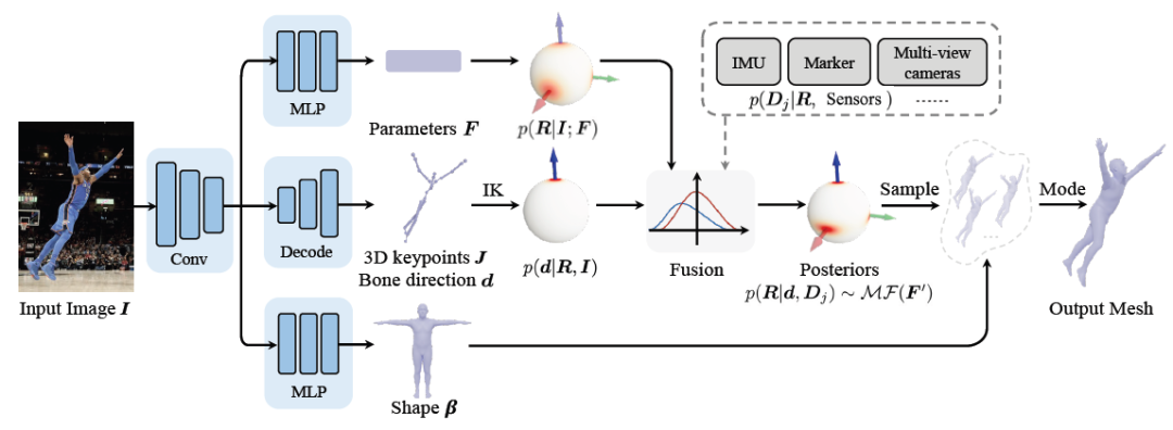 基于前述理论和推导,可以直接构建出下图所示的框架图。利用多分支网络从单张图片中估计先验分布参数 F、三维关键点 J(从中计算出骨骼朝向 d)、外形参数 β。通过贝叶斯法则计算得到后验概率,最终可从后验分布中得到姿态估计,从而输出人体 mesh。