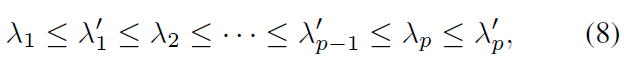 其中 M^T dl^T=ll^T 是一个秩 1 实对称矩阵,而 K 也是一个实对称矩阵,即后验的聚集项 K' 同样是实对称矩阵。根据矩阵分析中关于实对称矩阵的交错定理,可以得到 K' 的特征值 λ_i' 和 K 的特征值 λ_i 具有如下不等式关系: