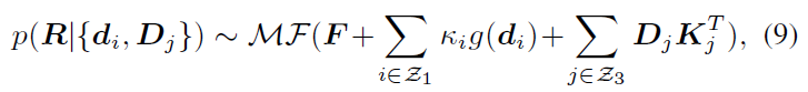 前述部分介绍了人体关节旋转后验概率的解析形式,该概率由一个新的参数 F' 表征。可以从另一个角度理解后验参数 F^',即 F^' 是与 F 相同的均值项 M 和一个新的聚集项 K^' 的乘积: