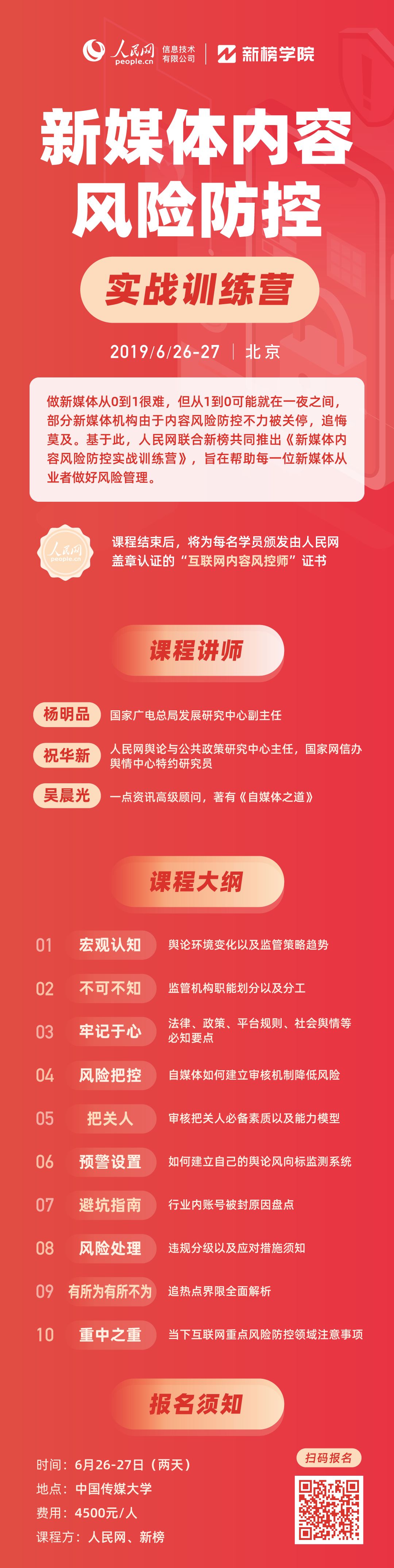 为提升互联网从业管理者内容风控意识及管理水平,人民网信息技术有限公司联合新榜共同推出「新媒体内容风险防控实战训练营」课程,帮助新媒体从业者做好风险管理。