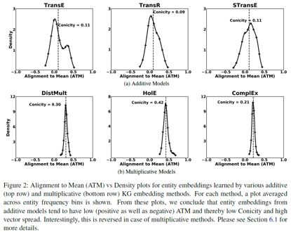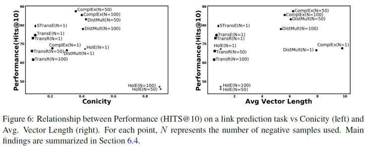 乘法模型的锥度(conicity)随着反例数量的增加而增大,而加法模型的锥度对反例数量不敏感。在平均向量长度(AVL)方面,乘法模型中的DistMult和ComplEx随着反例数量的增加而减小,HolE则几乎没有变化,这是因为HolE把实体向量限制在了单位球内。所有加法模型的AVL也对反例数量不敏感,而它们也有和HolE类似的限制。