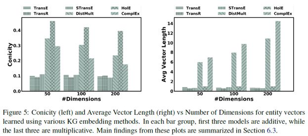 本文的主要考虑6个知识图谱的嵌入表示模型,并把6个方法分为两类。一类是加法(additive)模型,有TransE[2]、TransR[3]和STransE[4];另一类是乘法(multiplicative)模型,有DistMult[5]、HolE[6]和ComplEx[7]。同时,本文采用了两个常见数据集FB15K和WN18。本文主要从以下4个发现展开实验分析。