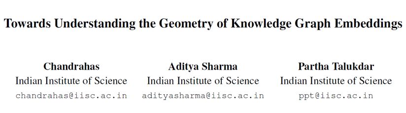 [1] Chandrahas, Aditya Sharma, Partha Talukdar: Towards Understanding the Geometry of Knowledge Graph Embeddings. ACL 2018: 122-131.