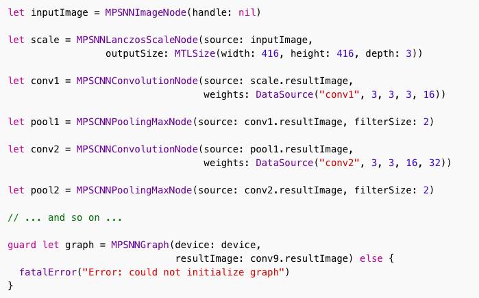 我们首先为输入图像声明一个节点,并将一个将该输入图像缩放到416×416。接下来每个层都使用source参数连接到前一个层。所以scale节点连接到inputImage,conv1被连接到scale.resultImage,等等。graph本身是一个MPSNNGraph对象,并连接到网络中最后一层的输出conv9。