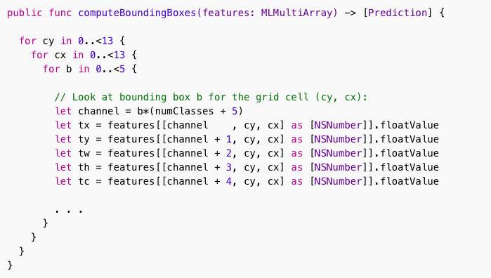 注意:使用正确的顺序索引多数组很重要。最初我写了features[[channel, cx, cy]],然后所有的边框都反了。浪费了一些时间才想明白...注意Core ML放入数据的顺序!