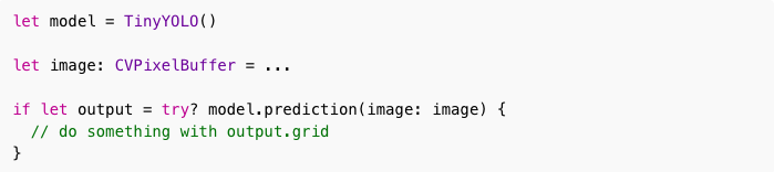 理想情况下,我们不会TinyYOLO直接使用这个类,而是通过Vision框架。不幸的是,我无法让它工作(在beta 1和2中)。
