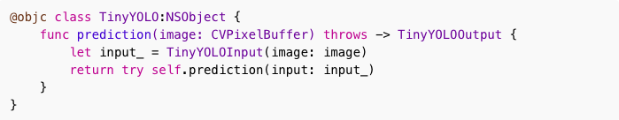 这个类还有很多代码,我可以暂不关心。我们关心的是prediction(image)方法。此方法输入CVPixelBuffer(一个包含图像的对象)并返回一个TinyYOLOOutput对象。