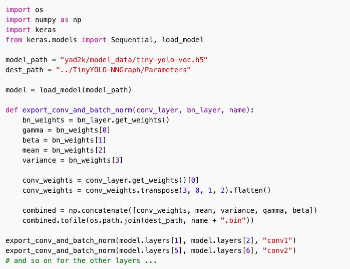 然后,它遍历所有卷积层,并将权重与批次正则化参数一起放入单个文件中,每个层一个文件。这样做不是必须的,而且还会有大量的小文件。但这使得在应用程序中更容易加载这些数据。