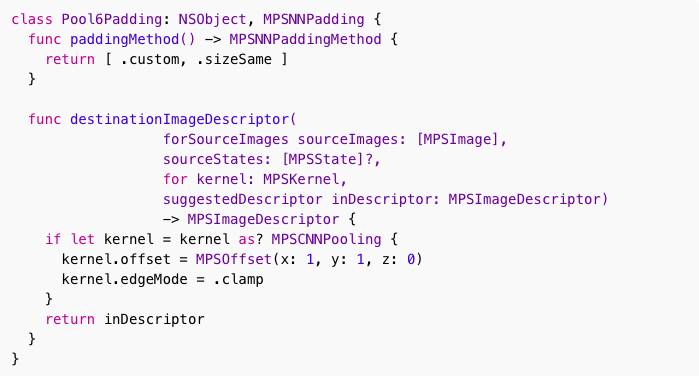 在这个函数内部,我们可以访问底层MPSCNNPooling对象,以便我们可以设置其offset属性以获取.alignTopLeft行为,并将其设置edgeMode为.clamp。