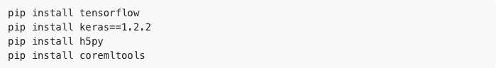 这些都是我们要用到的包。现在我们可以为Core ML创建一个虚拟环境。我们要把所有Python包装到这个虚拟环境 - 这样和其他版本的python相隔离,不会影响其他版本的python包。这可以让我们在同一个系统上运行不同版本的Python和Keras。