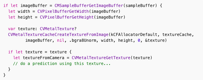 使用Core ML,输入图像必须是一个CVPixelBuffer,但Metal需要MTLTexture。在下面代码中,我们可以轻松地将相机中的像素转换为texture: