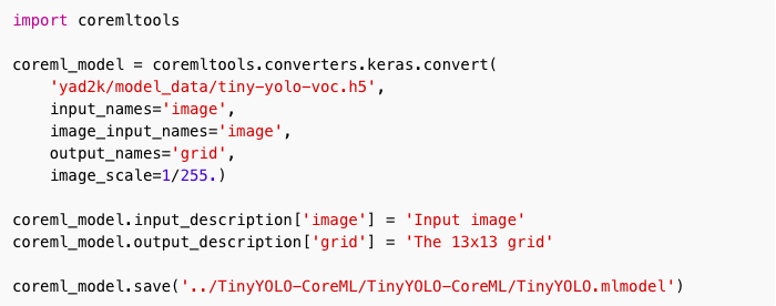 是的,它也需要做一些转换。我们再次使用由YAD2K创建的Keras 1.2.2模型。(您可以使用Keras 2.0,因为我已经为Core ML制作了一个1.2.2模型,就使用它吧。)