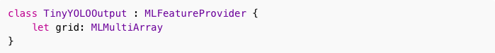 这个类的相关部分是MLMultiArray对象。它包含13×13网格的边框预测。(该属性被称作grid,是因为我们在转换脚本中,使用output_names='grid'这个参数指定了该属性。)