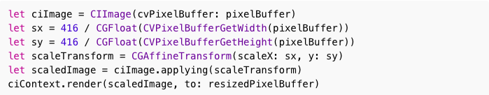 但是,相机返回480×640图像,而不是416×416,所以我们必须调整相机输出的大小。不用担心,Core Image 有相关函数: