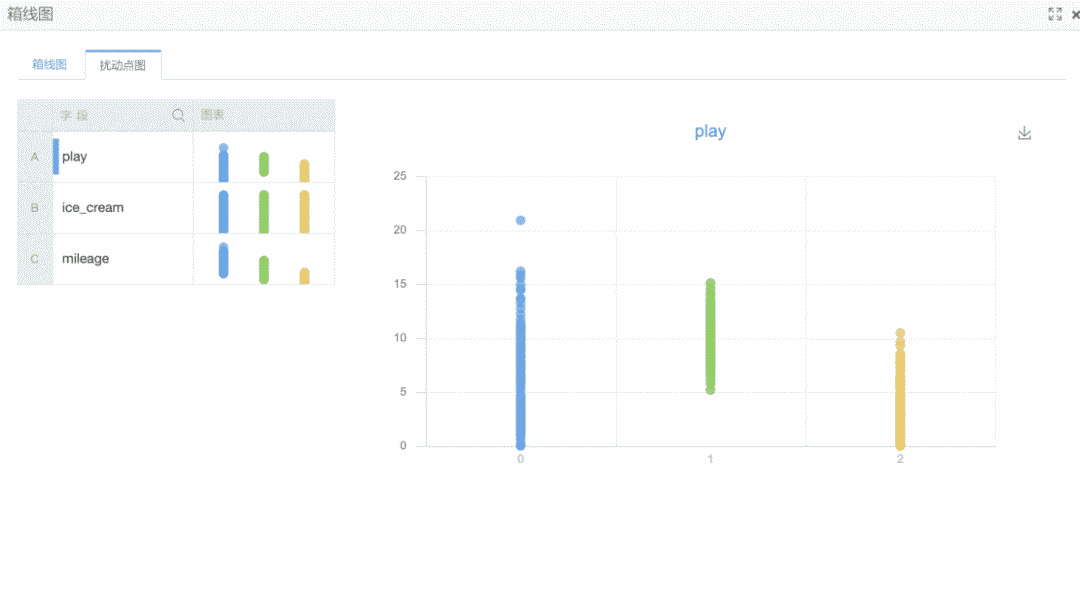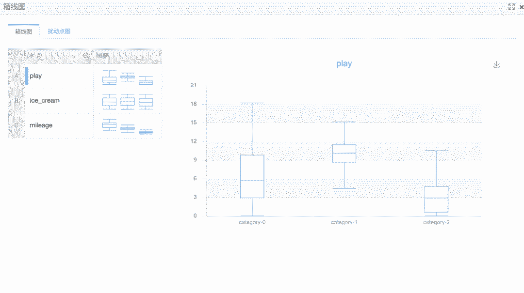 1,箱线图组件分两个tab分别显示箱线图和扰动点图,在左上角都可以选择观测不同的特征。右侧显示该特征下,每个类别的分布情况。
