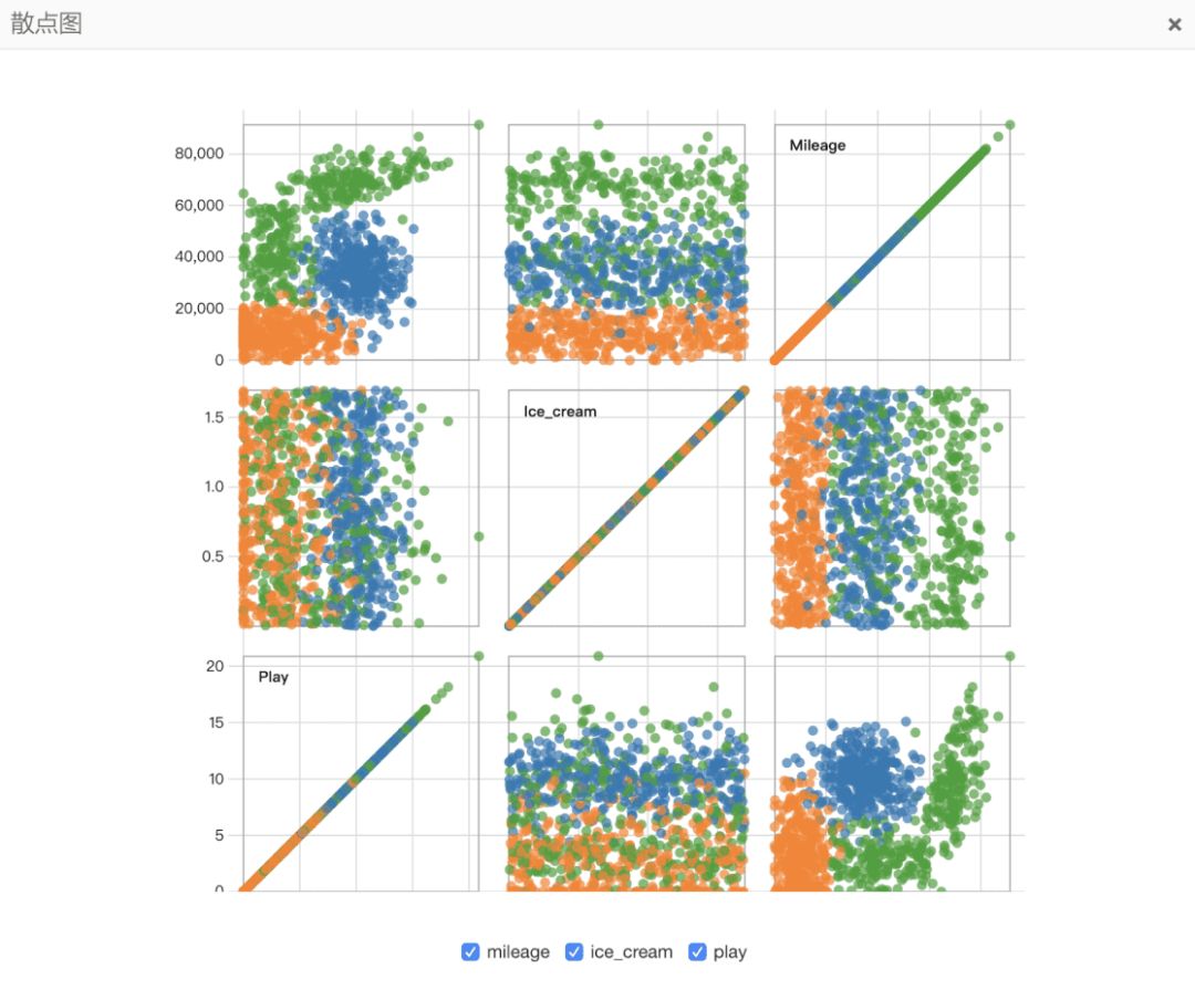 2,除了反对角线上的三个方形,其他方形则是反映了两两特征之间的分布情况。比如第一排第一列(1,1),横坐标为play,纵坐标为mileage。从这个方形上可以直观观测出不同颜色的散点集中分布在不同区域。