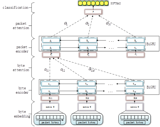 研究人员提出的分层注意力模型,可以从字节和数据包这两个层面学习流量信息。该模型使用双向GRU(Gated Recurrent Unit)构建字节表示,并通过注意机制给不同的字节分配不同的权重,一些与分类目标直接相关的关键字节在编码过程中被赋予更多权重。数据包表示的构建与此类似,最后使用注意力机制汇总构建整个TCP(Transmission Control Protocol)流的表示向量。